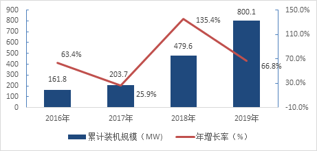 圖1:中國已投運(yùn)光儲(chǔ)項(xiàng)目的累計(jì)裝機(jī)規(guī)模(2016-2019年)