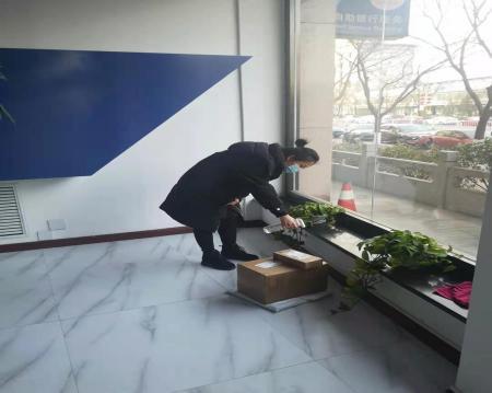 有序的排隊(duì)測量體溫、登記 | ![]() 快遞放置區(qū)、對快遞進(jìn)行消毒 | ![]() 發(fā)放防疫物資、做好防控保障 |