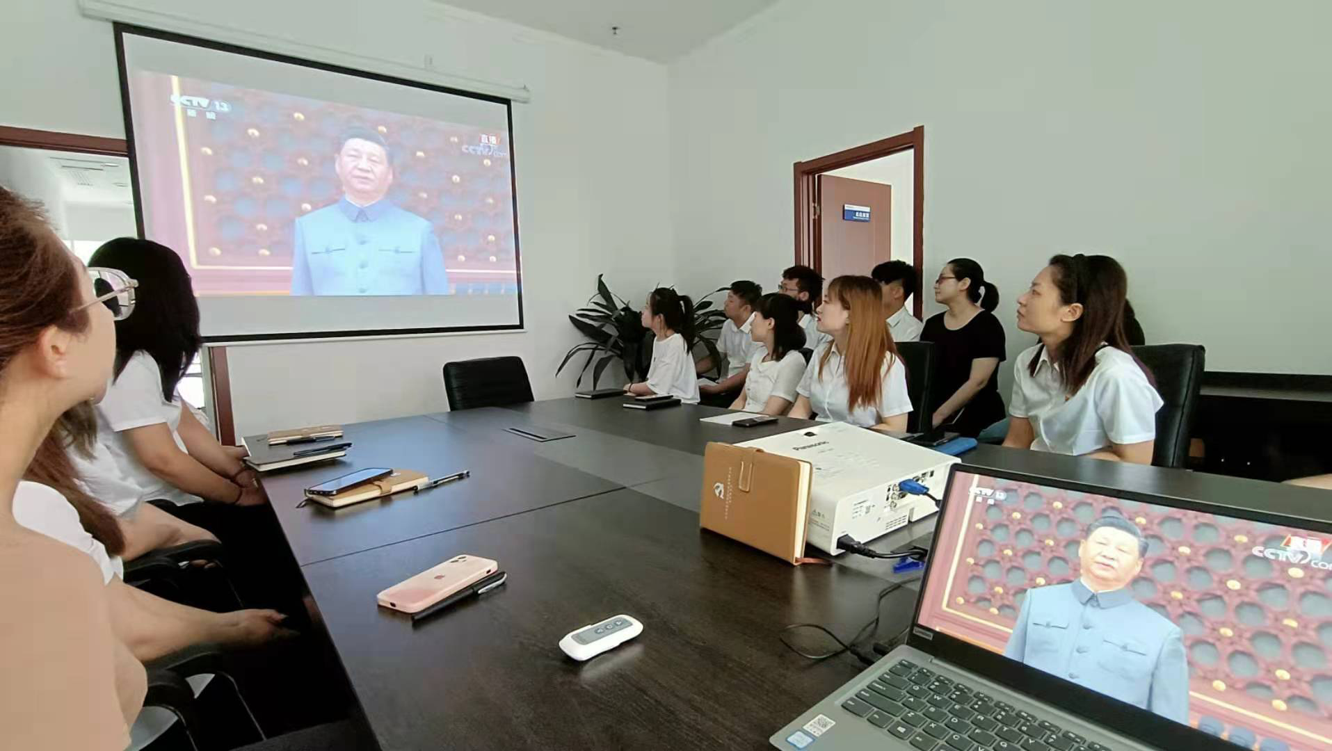 通過大屏幕,看到習(xí)近平同黨和國家領(lǐng)導(dǎo)人登上天安門城樓主席臺,看到天安門廣場人頭攢動時,大家目不轉(zhuǎn)睛、聚精會神、認真收看。電視直播期間,認真聆聽習(xí)近平總書記的重要講話,邊看邊記筆記,總書記振奮人心的講話,會議室不時響起掌聲。一小時四十分鐘的直播,大家始終沉浸在熱烈莊重、恢宏磅礴的慶祝氛圍之中。大家紛紛認為,百年恰是風(fēng)華正茂,未來仍需風(fēng)雨兼程,站在新的歷史起點上,更須不忘初心,砥礪前行。